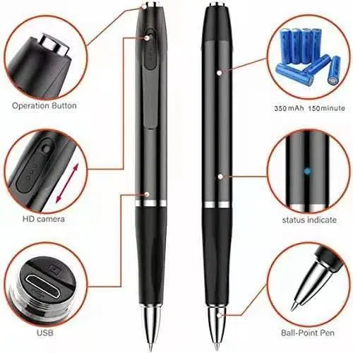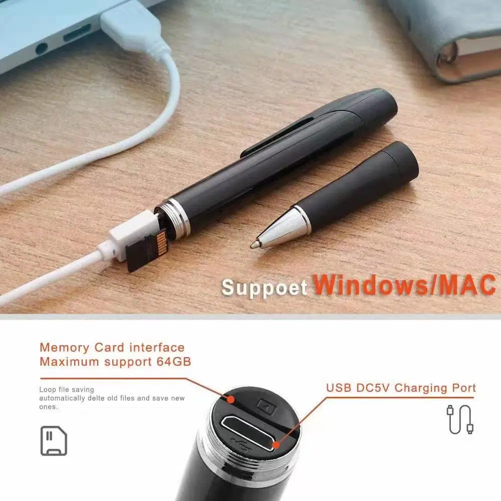 規格: 使用筆式相機之前,請先充電 *視頻分辨率:1080P *視頻格式:AVI *幀頻:30 FPS *電池容量:350mAh *工作時間:長達120至150分鐘 *存儲容量:支援4-64GB卡 *記錄面積:約5平方米 *電源輸入:DC 5V / 1A *夜視:是 *充電時間:約2小時 Specifications: Please charge first before you use the pen camera * Video resolution: 1080P * Video format: AVI * Frame rate: 30 FPS * Battery capacity: 350 mAh * Working time: Up to 120 to 150 minutes * Storage capacity: External TF card 4-64GB (Not Include) * Recording area: About 5 square meters * Power input: DC 5V/1A * Night vision: Yes * Charging time: About 2 hours